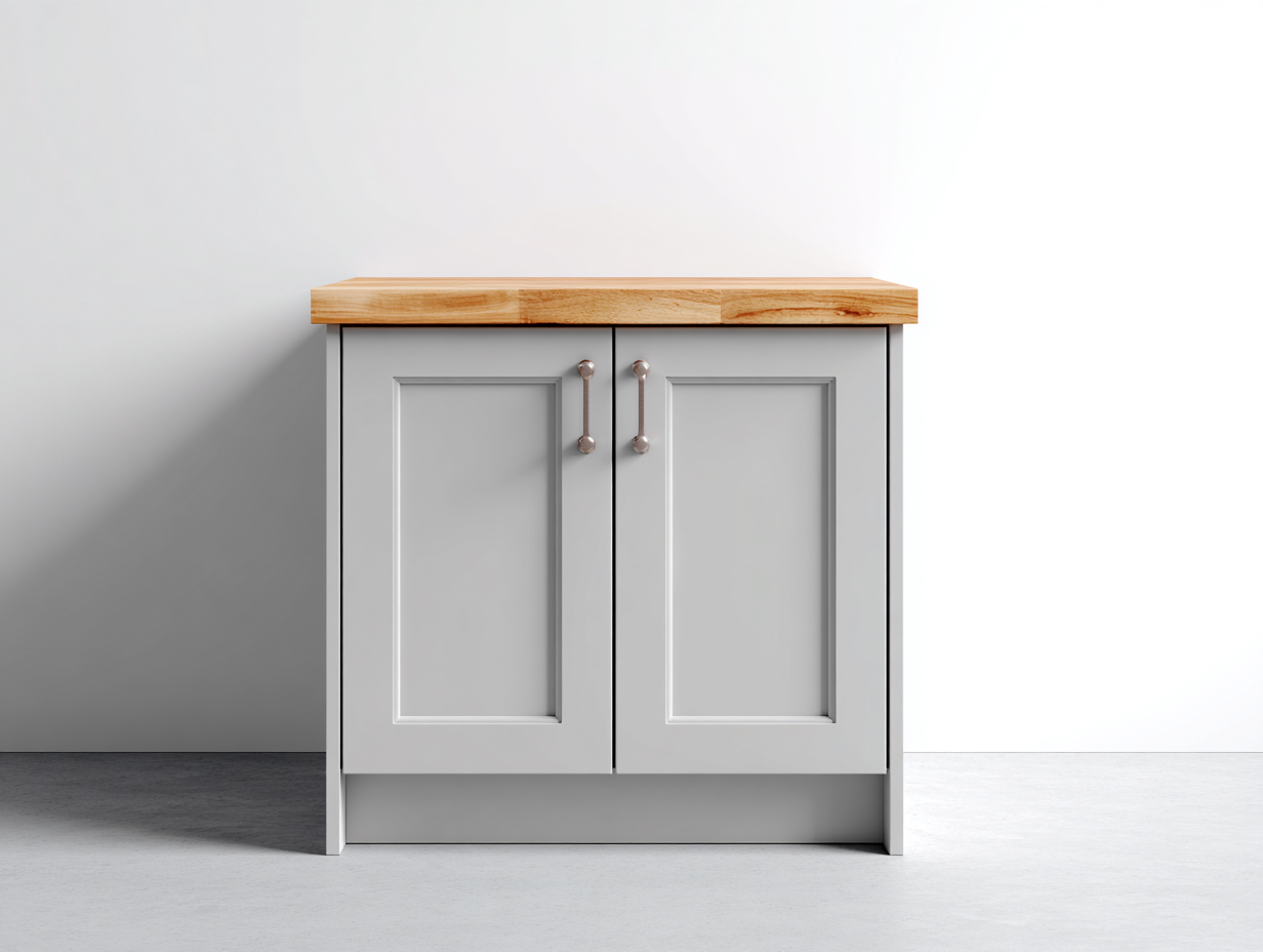 Struttura con finitura grigio chiaro e piano superiore effetto legno naturale.