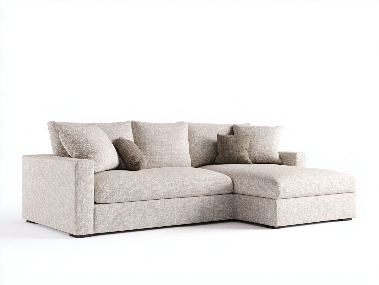 Divano angolare elegante in tonalità beige, ideale per soggiorni luminosi.